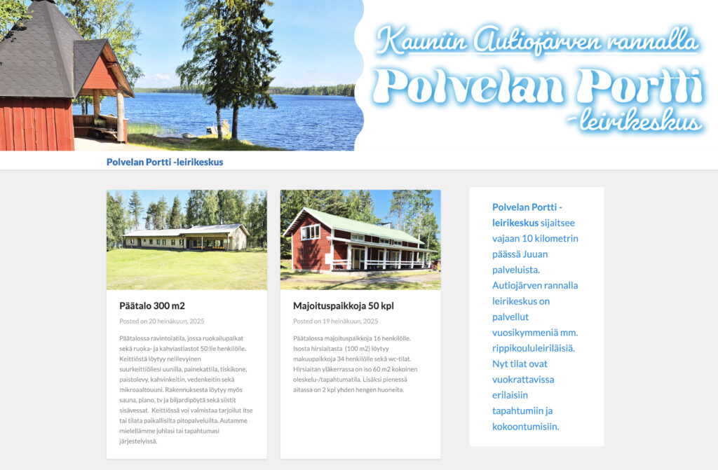 Aiemmin seurakunnan leirikeskuksena toiminut kiinteistökokonaisuus vaihtui yksityisen yrittäjän omistukseen. Leirikeskuksen markkinointinimeksi päätyi Polvelan Portti. Tiloja vuokrataan jatkossa erilaisiin tapahtumiin ja kokoontumisiin. Leirikeskus sijaitsee kauniin Autiojärven rannalla Juuassa. Tarve oli esitellä kaikki alueelta löytyvät majoituspaikat ja ravintolatilat, sekä rannalta löytyvät saunat sekä kota.